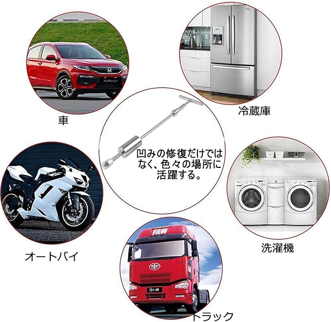 応用範囲:車、バイクのボディ&フェンダーの補修や、ドア、冷蔵庫、洗濯機などの凹み修理ができます。凹みの大きさによってタブを利用してください.