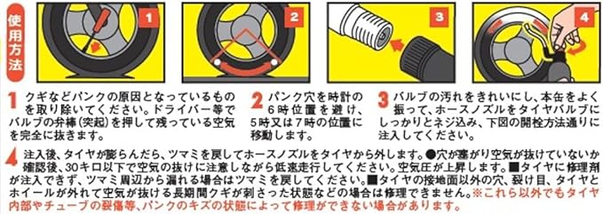 パンクしたその場で直せます。タイヤも同時に膨らみます。チューブレス、ラジアルタイヤに最適です。小型バイク125㏄以下に使用可能です。