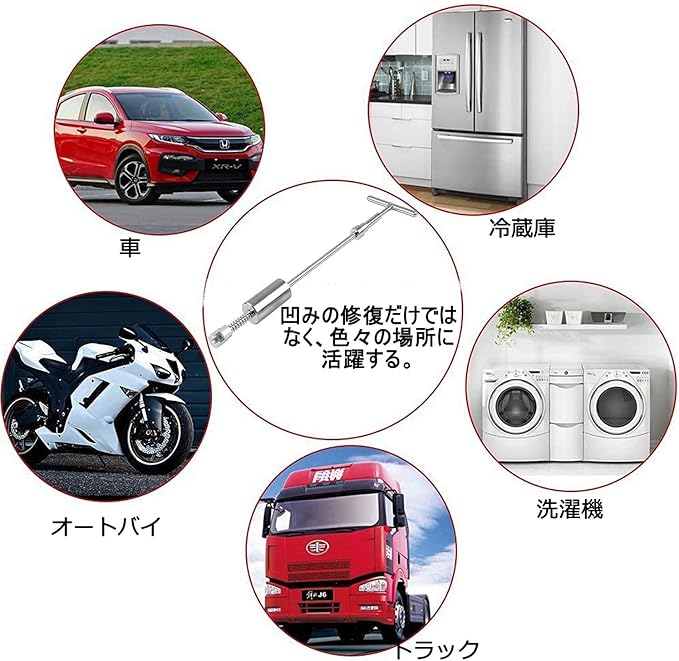 応用範囲:車、バイクのボディ&フェンダーの補修や、ドア、冷蔵庫、洗濯機などの凹み修理ができます.
