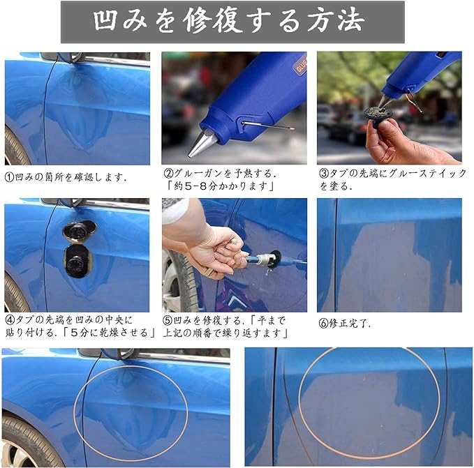 商品特性:修理工場の修理は数日間が掛かりますが、今はそなん必要がなく、自分で簡単に作業し、短時間で凹み直しが可能です。気になる凹みをパテも塗料も使わず簡単に補修が出来ます。愛車を綺麗に手入れします.
