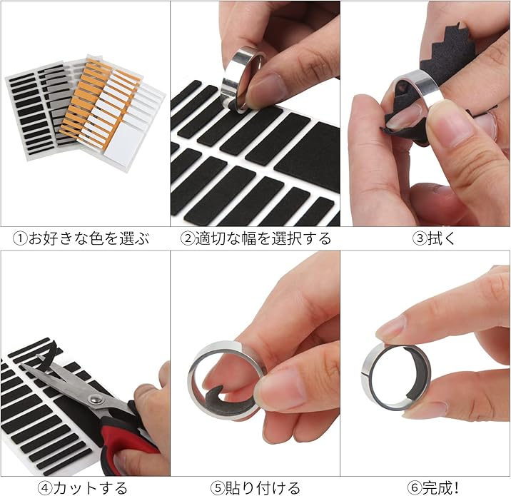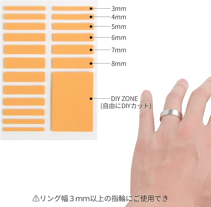 ❤サイズ:厚さ:1.5MM 幅:3MM/4MM/5MM/6MM/7MM/8MM+自由にDIYカットできるDIY ZONE(⚠️リング幅3mm以上の指輪にご使用できます。3mm以下の指輪に使用すると、粘着シートの粘着面が狭くなり、指輪にしっかりと接着できなくなる場合があります。)