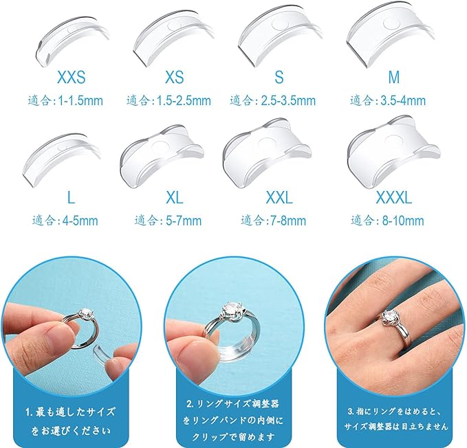 【男女兼用】男性と女性のリングに適しており、このリング調整器セットはリングが緩すぎるか、締め付けられすぎる問題を解決するのに最適です。リングサイズの調整は必要ありません。簡単に着用でき、リングを自在にしましょう。