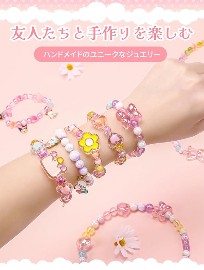 【製品の内容】:1箱入;付属8点セット:子供用安全はさみ1本、0.7 mm弾性線1巻、ストラップ1個(ランダム)、カチューシャ2個、鈴5個、開口輪5個、カチューシャカバー4個、チュートリアル図面1部(中国語の取扱説明書) 【豊富な女の子 おもちゃ】ビーズ 手芸 に用いられる小さな飾り玉。アクリル製で、様々な形があり、色も多様、つないで使います。ネックレス、ブレスレット、キーホルダー、ピアス、手飾りなどに最適です。おしゃれ心が芽生えだす女の子にとって魅力的な、かわいいオリジナルのアクセサリーを作りましょう!6歳以上の子供に適用しています。 【カラフルなビーズおもちゃ】カラフルなビーズが入っているので、子供は遊びながら集中力や色彩力も養えます。また、お子様の想像力や思考力、発想力、創造力を育みます。親子で楽しめるので、家族のコミュニケーションにも役立つことがあります。 【人気なプレゼント】初心者でも自分のオリジナル作品が簡単に出来るビーズセットです。カチューシャのストッパーはついています。一緒にかわいいオリジナルアクセサリーを作り、楽しい親子時間を過ごせます。お祭り、縁日、誕生会、学校のイベント、お祝い事、クリスマスなど様々なシーンで大活躍! 【収納にも便利】便利な収納ケース付き、アクセサリーを作りたい時に簡単に持ち出し、遊んだ後はすべてケースに入れれば、簡単にお片づけができます。子供の収納意識を高めるだけでなく、省スペースでパーツの紛失も防ぎます。