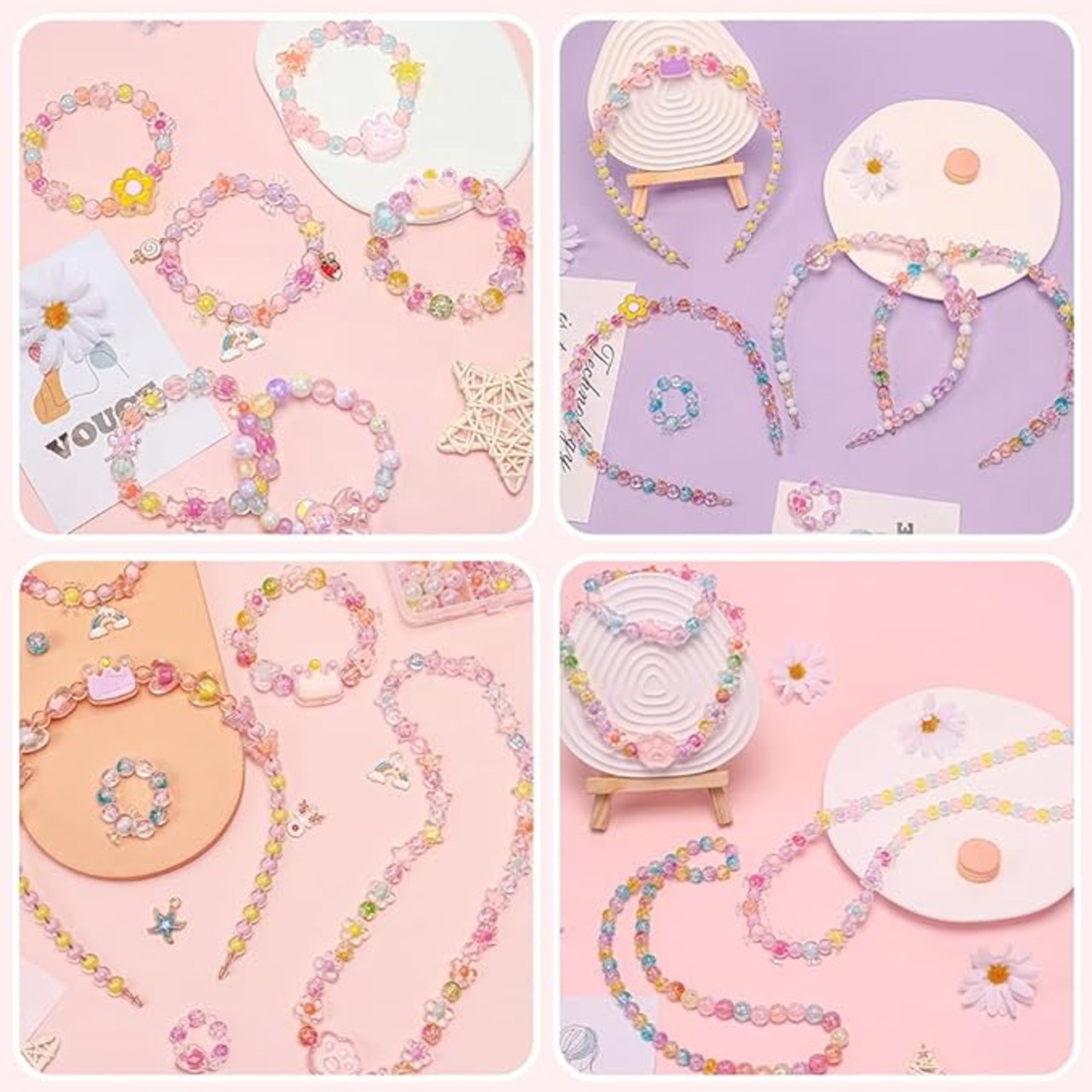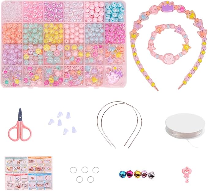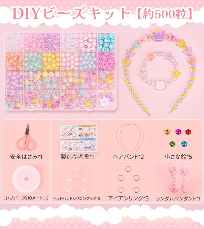 【人気なプレゼント】初心者でも自分のオリジナル作品が簡単に出来るビーズセットです。カチューシャのストッパーはついています。一緒にかわいいオリジナルアクセサリーを作り、楽しい親子時間を過ごせます。お祭り、縁日、誕生会、学校のイベント、お祝い事、クリスマスなど様々なシーンで大活躍!