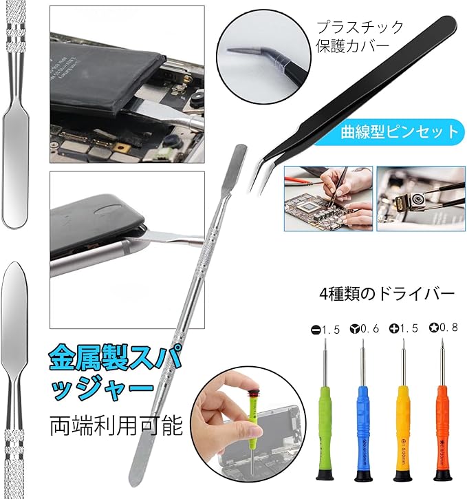 さらに、耐摩耗性に優れた鋼製のピンセットも同梱されており、スマホ修理作業に必要な道具が一括して手に入ります。