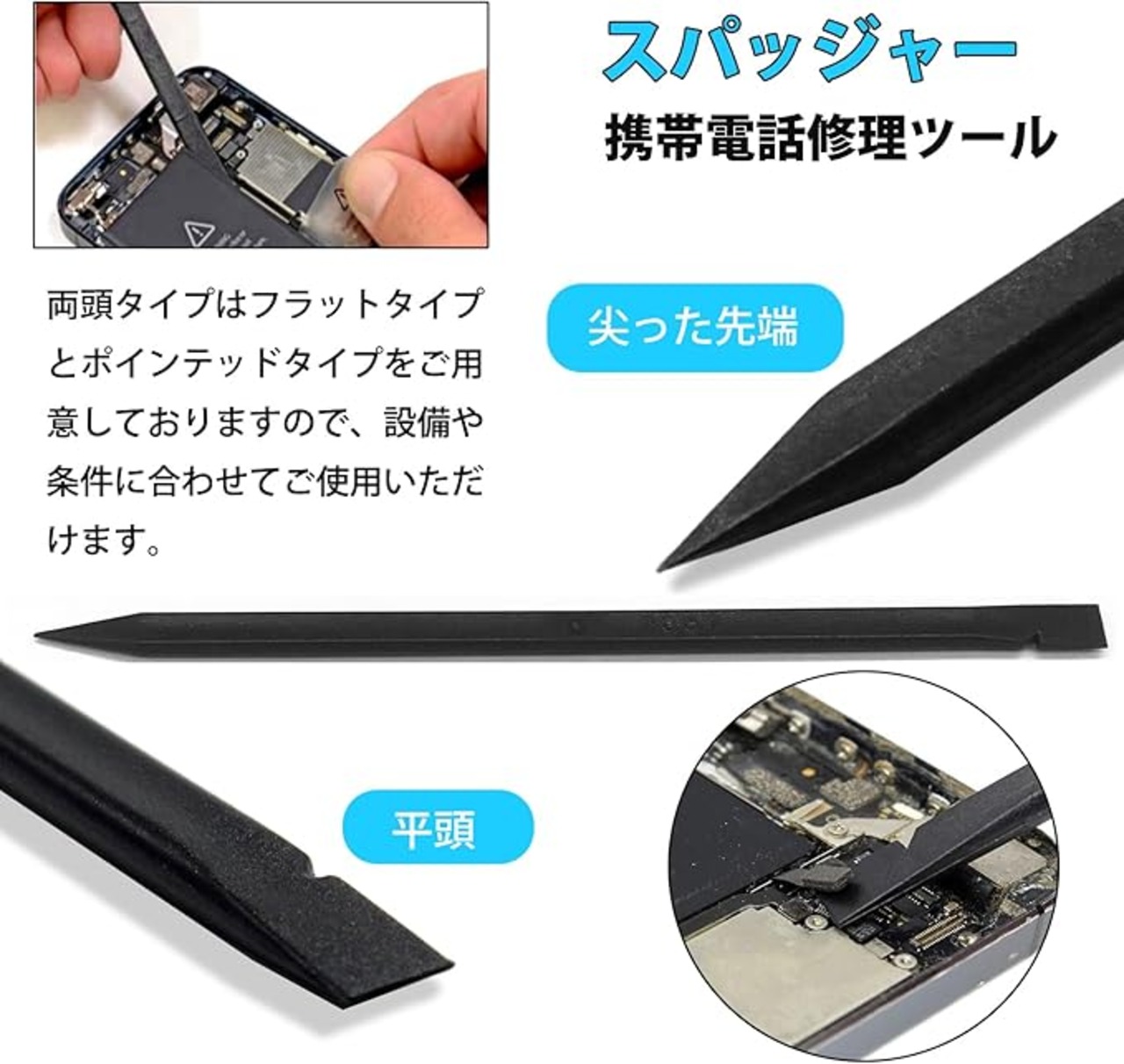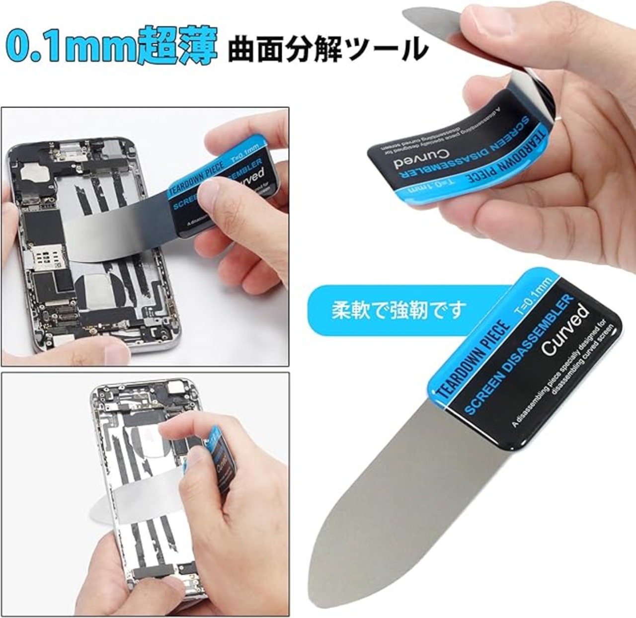 このスマホ分解ツールは、シェルを開くさまざまな状況に応じて、(素材・厚さ・幅違い)さまざまなスパッジャーを提供します。