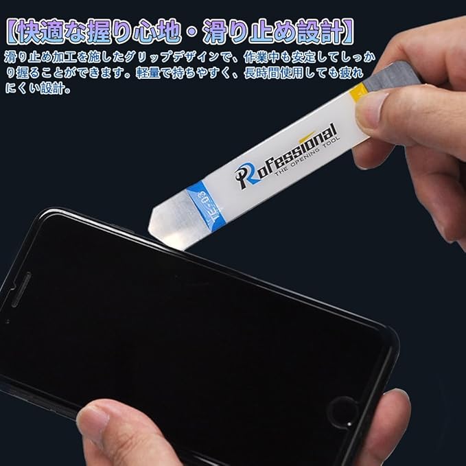 セット内容:①超薄型ソフトメタルオープナー 2、②リフター 1、③カーブスクリーン用オープナー 1。スマートフォン、タブレット、ノートパソコン、ゲーム機などの分解・修理に欠かせない便利なツールセットです。バッテリー交換、背面カバーの取り外し、液晶画面の分離、パーツ交換など、あらゆる作業に対応します。