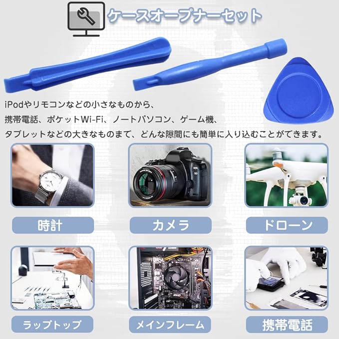iPodやリモコンなどの小物から、携帯電話、ポケットWi-Fi、ノートパソコン、ゲーム機、タブレット端末などの大物にも適しています。バッテリー交換やパネル修理、カスタム改造に最適なツールです!スマートフォン修理、タブレット修理、パソコン修理、その他電子製品修理のためのツール。