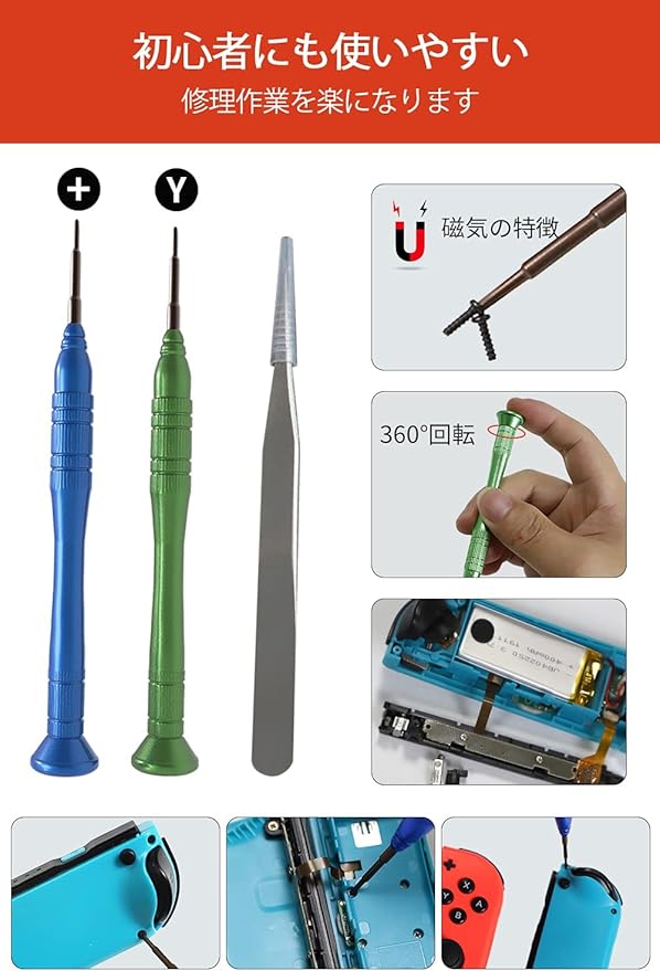 【改良されたドライバー・耐久性優れた】Y字ドライバーがニンテンドースイッチコントローラの分解に必要。ドライバーに磁気を搭載し、使用する時にネジを落とす心配もありません。アルミニウム合金を使用して、耐久性と耐摩耗性を備えました。 予備ネジも用意しているので、本体のネジが壊れた場合でも安心です。