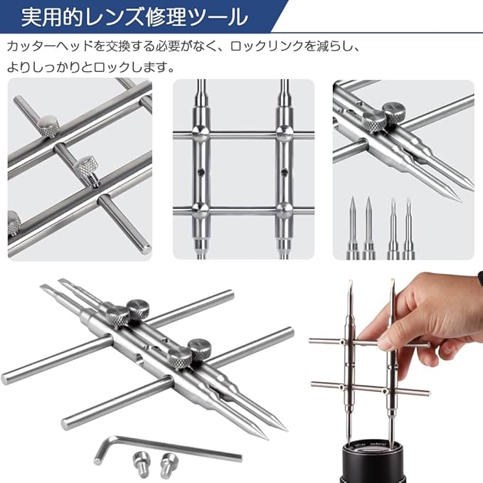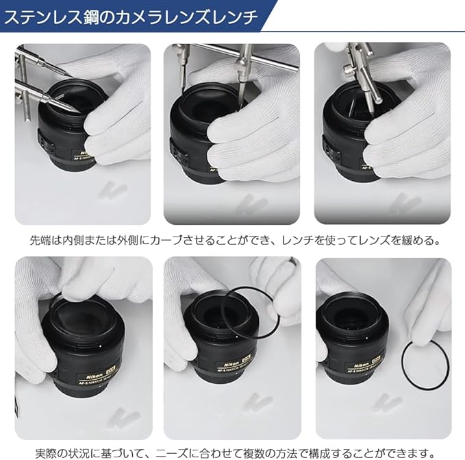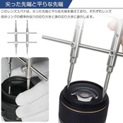 尖った先端と平らな先端:このレンズスパナは、尖った先端と平らな先端を備えており、それぞれレンズ保持リングの標準的な穴の切り欠きと溝の切り欠きに適合します。