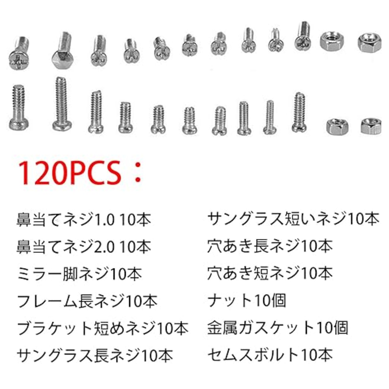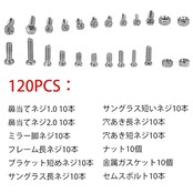 12種類の型番ビス120個(1.2ナット 10、1.4ナット 10、1.0 x 3.6 10、1.2 x 3.6 10、1.4 x 2.4 10、1.4 x 2.6 10、1.4 x 2.8 10、1.4 x 3.0 10、1.4 x 4.0 10、1.4 x 4.5 10、1.4 x 6.0リセットハンド 10、1.6 x 4.5 10)。