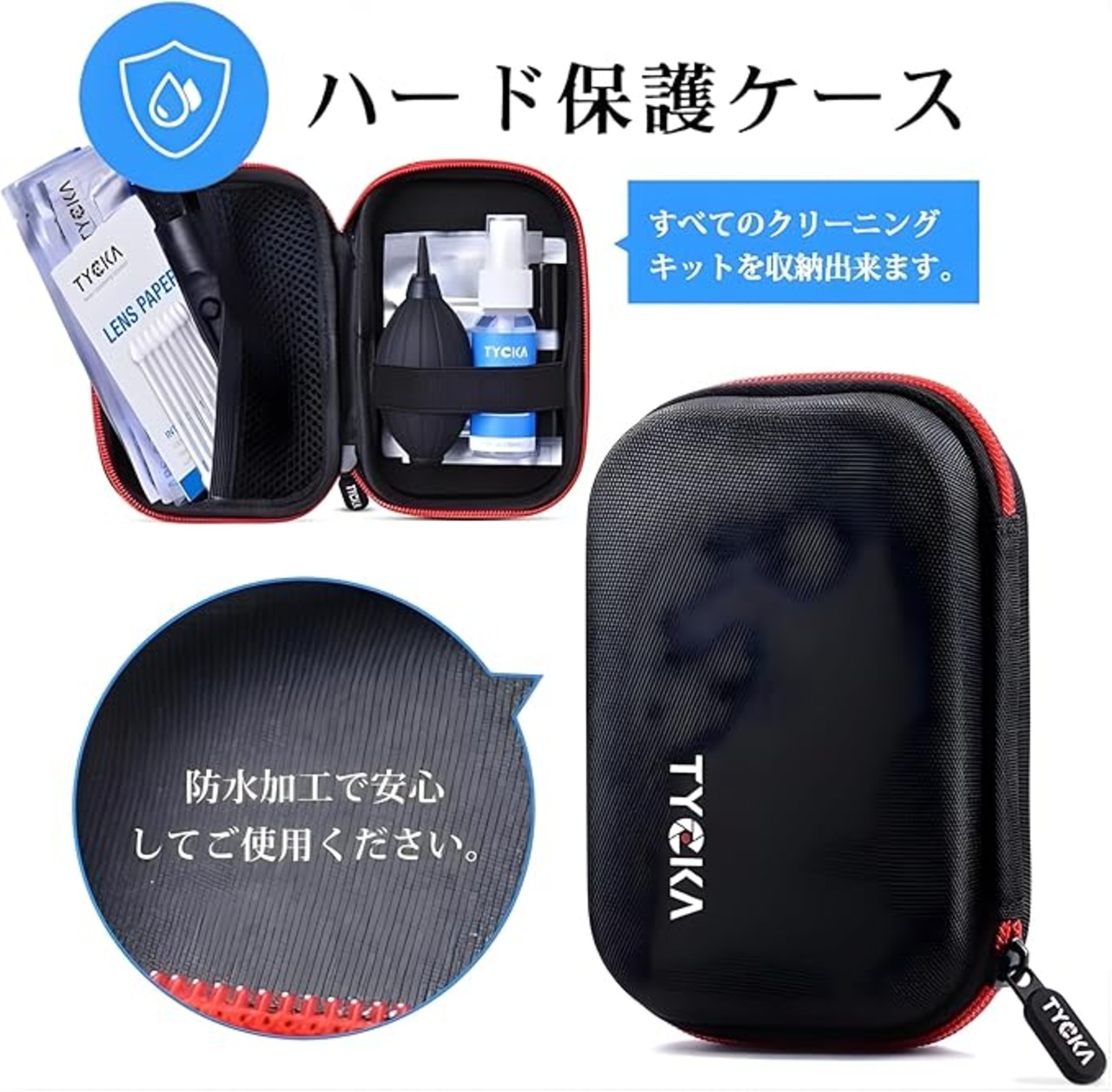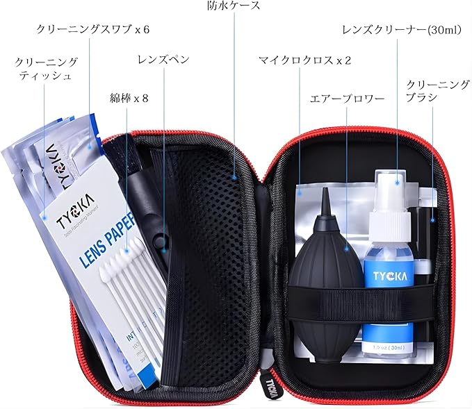 【クリーニングセット】30ml無毒性レンズ洗浄液x1、エアーブロワーx1、レンズクリーニングペンx1、クリーニングブラシx1、マイクロファイバークリーニングクロスx2、綿棒x8、センサークリーニングスワブx6 、50枚カメラクリーニングティッシュx1、防水ハードシェル保護ケースx1