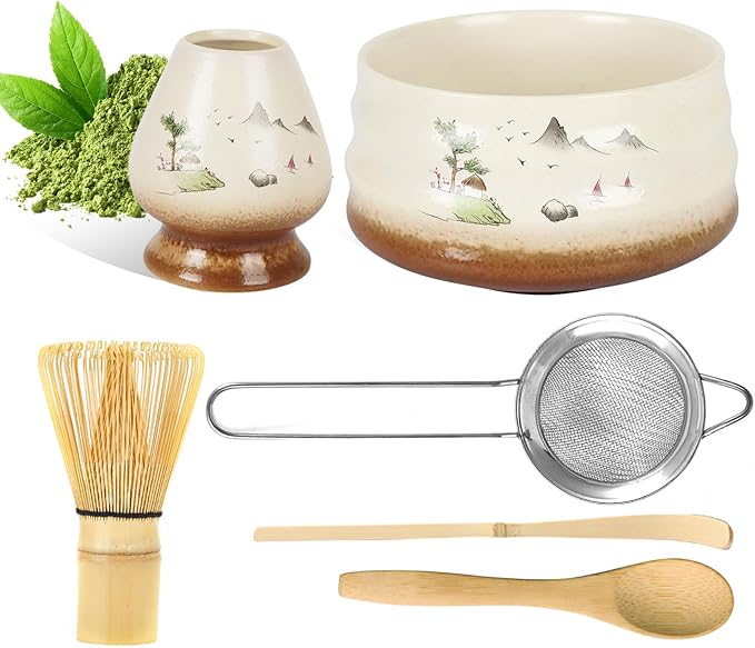 YTCYKJ 茶道具 6点セット 抹茶セット 日本茶セット 抹茶キット 抹茶泡立て器セット お抹茶 本格 おうち時間グッズ 抹茶茶碗 茶筅 茶筅くせ直し 茶杓 初心者 抹茶スターター (風景画)