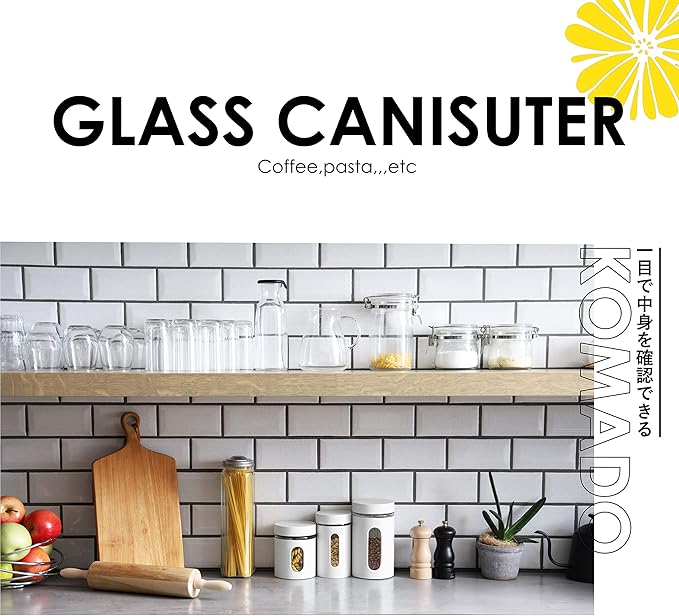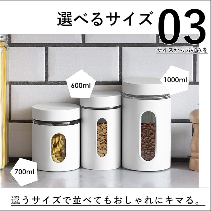 コーヒーやパスタなど、食材の収納に便利な窓付きのガラスキャニスター。