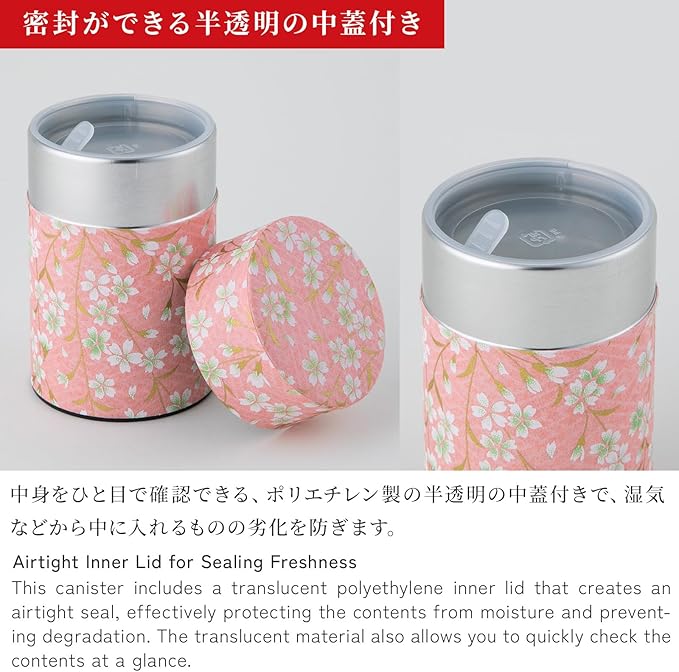 のレン 茶筒 茶缶 キャニスター 100g缶(和紙の茶筒 - 京桜 ピンク) / 日本製 友禅和紙 スチール缶 中蓋つき 密閉 容器 保存容器 乾物容器/茶筒 おしゃれ お茶缶 容器