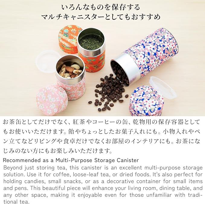 【使い方はさまざま】お茶缶としてだけでなく、紅茶やコーヒーの缶、乾物用の保存容器としてもお使いいただけます。飴やちょっとしたお菓子入れにも。小物入れやペン立てなどリビングや食卓だけでなくお部屋のインテリアにも。お茶になじみのない方にもお楽しみいただけます。