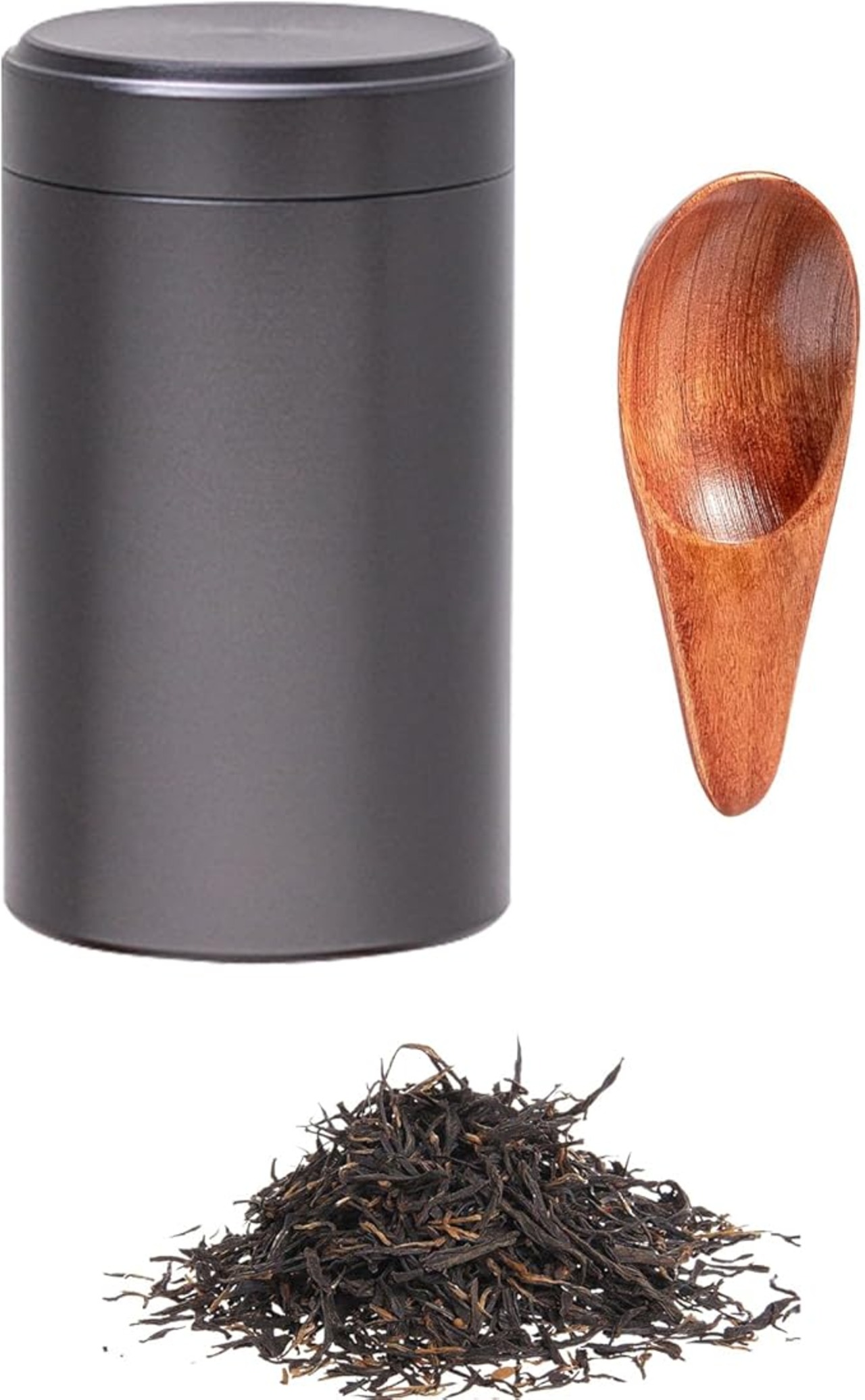 【絶妙な外観と実用的な機能】:シンプルで趣のあるフォルムの茶筒は、繊細な金属の質感があり、控えめでありながら高級感があります。 また、木製のスプーンも付属しており、お茶の出し入れがしやすく、ティータイムがさらに充実します。