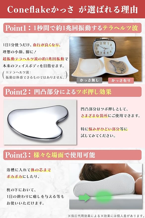 ✅【商品基本仕様】気になる箇所がするんっ!1兆回振動する かっさプレート 。1秒間に約1兆回振動するテラヘルツ波が、気になる箇所にアプローチ。スッキリとした顔・脚になる効果が期待できます。