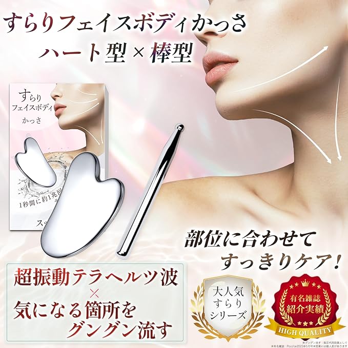 ✅【商品仕様】業界話題の1兆回振動! かっさ を展開するSurariシリーズから、ハート型と棒型のセットが登場。1秒間に約1兆回振動するテラヘルツ波が、気になる箇所にアプローチ。気になる箇所がするんっ!スッキリとした顔・脚になる効果が期待できます。