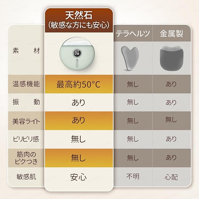 【100%天然石&天然冷感】 温感かっさ CaPoは、従来のかっさプレートとは異なり、ヘッドは天然石100%を使用した天然石かっさで、なめらかで肌にやさしい使い心地。電流によるビリビリ感がない温感かっさとして、じんわり広がるあたたかさを安定してキープします。非加熱時には、天然石ならではのひんやりとした冷感で、すっきり爽やかなケアが楽しめます。敏感肌の方でも使いやすく、さまざまな肌タイプに心地よくフィットします。