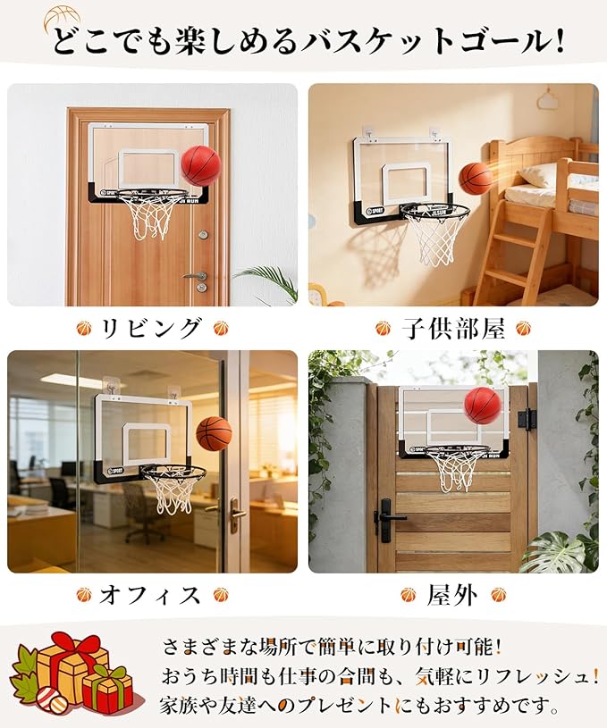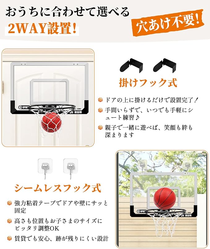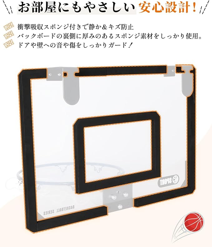 【設置簡単・壁を傷つけない】ドアやクローゼットに掛けるだけで、すぐにバスケコートが完成!穴あけ不要で、賃貸住宅でも安心です。フックの裏側とバックボードの裏には厚い保護フォームが付いており、ドアへの衝撃を吸収し、壁やドアの傷を防ぎます。リビング、子供部屋、寝室など、好きな場所で 室内練習 が可能です。