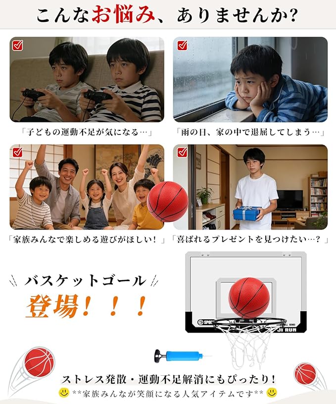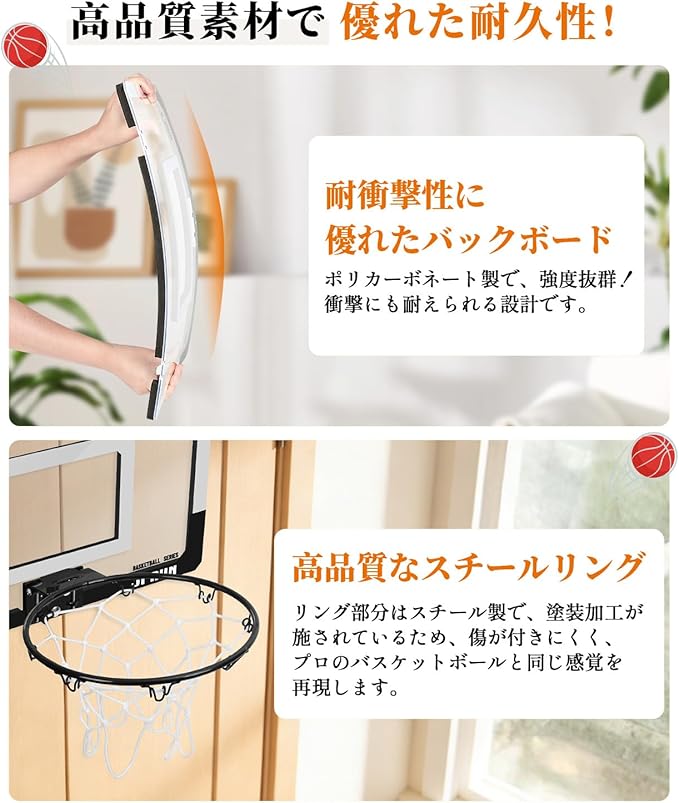 【 仕様】ポリカーボネート製のクリアで丈夫なボードバスケットボード:幅45x高さ30cm、リング内径23cm、子供用のバスケットボールの直径は15cmで8~10歳の少年に適合です。バスケットボールと空気入れポンプが付属! 組み立ても簡単で、面倒な準備はありません。お誕生日やクリスマス、進級祝いなどのサプライズプレゼントに大変喜ばれます。