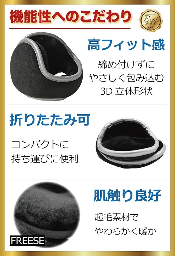 ✅【 3つの違い 】1:厚手のボア生地→保温性が高く暖かい温度がキープされます。 2:大きめの耳当て部分→気密性が高く、冷気が入りません。 3:柔らかい生地感→気持ちよく優しい肌触り。 ✅【 耳をしっかり覆う安心感 】 耳の隙間から冷気が入らないよう、耳全体をしっかり覆う大きめの3D立体設計に。 ✅【 締め付けない:快適な装着感 】 ズレや落下が起きにくいバッククリップ可動式。サイズ調整もでき、耳に心地良くフィット。ストレスフリーな使用感が得られます。 ✅【 折りたたみ式で持ち運びも便利 】 折り畳めるのでコンパクト。バッグに楽々収納が可能。耳から外して首にかけてもOK。使いやすさも大切にしました。