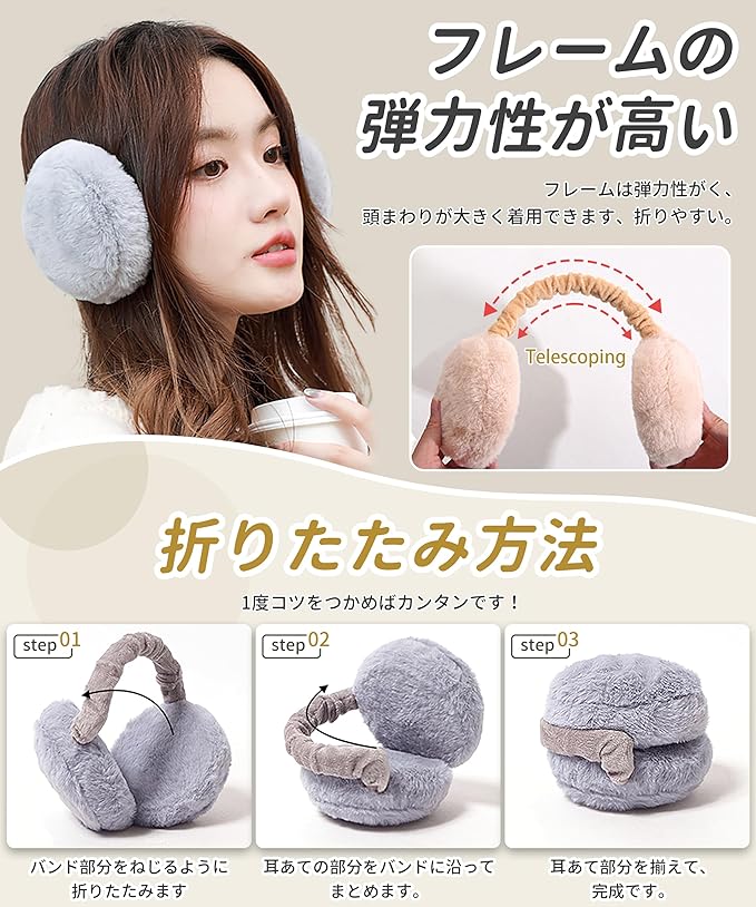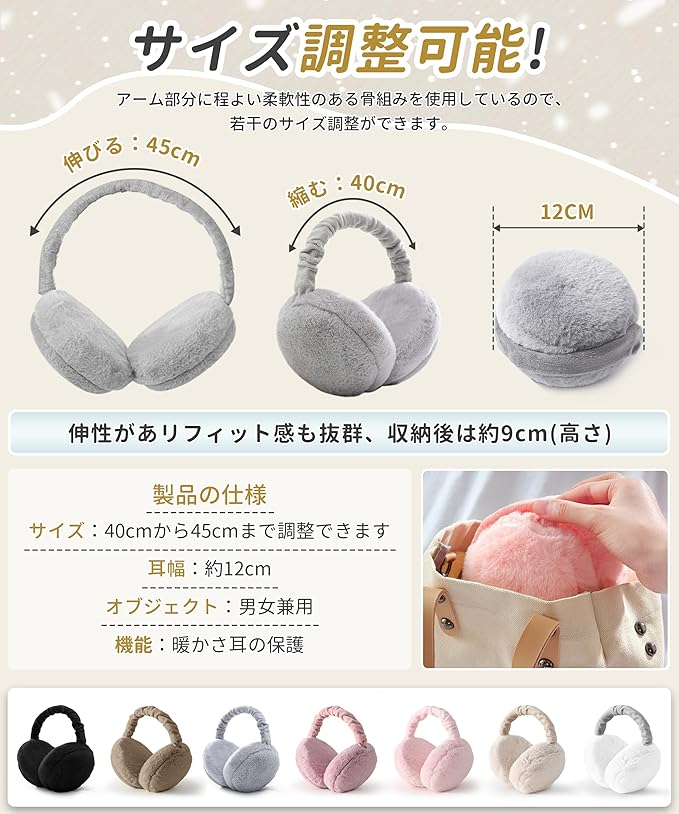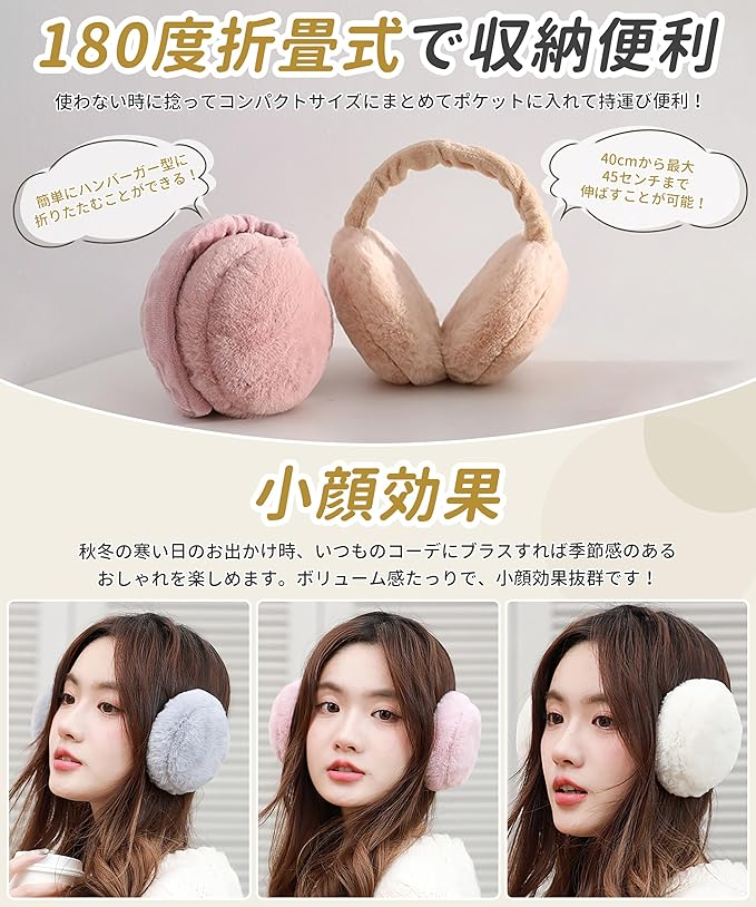 【サイズ調整可能・耳が痛くない】イヤーウォーマーのマーム部分には柔軟なスライドレール式骨組みを採用し、頭の大きさに合わせて40cmから最大45センチまで伸ばすことが可能です。このイヤーマフはほとんどのアジア人女性に適しており、頭の頂部あるいは後部にも掛けられます。ふわふわのイヤーマフに輪郭をつけることでスタイル良く仕上げています。また、イヤーマフの内側にはとても柔らかくし、耳に締まらず、耳に対する圧迫感を軽減、長時間の着用でも痛くありません。