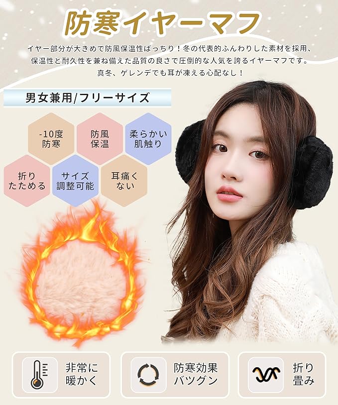 【ふわふわ贅沢なファー・蓄熱効果アップ】イヤーマフはやわらかな肌ざわりと暖かさがうれしい極上の起毛を採用、保温力を高めます。イヤーマフのイヤー部分が大きく、風を通さずに、耳の中の暖かさをさらに高めます!耳当て全体には肉厚起毛が施されており、たっぷりとした空気の層で体温が逃げるのを防ぐため、凍えるような寒さから耳を守ってくれイヤーウォーマー 耳あて。イヤーマフは装着した瞬間から暖かく、長時間装着しても疲れません。真冬でも耳が凍える心配はない!通学・通勤・お出掛けとも:風から耳を保護するのに最適です。