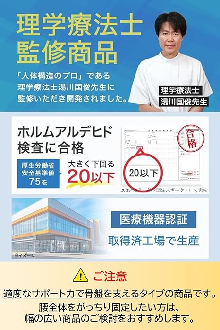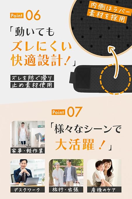 ✅【動いてもズレにくい】内側には滑り止めラバー素材を採用し、動いてもズレにくく、しっかりと骨盤をサポート。長時間の使用でも快適にフィットします。さらに、エアホールを配置することでムレを軽減します。