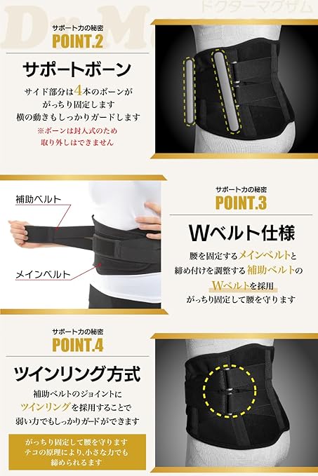 【コルセットは固定力でお選びください】腰回りの固定力が弱いものを使うと身体を動かすときに不安を覚えてしまうため、ますます動くことを躊躇するようになり、腰の筋肉が衰えてしまい、逆効果になってしまいます。3Dランバープレートでしっかりと支えるDr.Maxamのサポータは高い固定力と動きやすさがあり、着用をしながら徐々にコルセットなしの生活へサポートしてくれます。