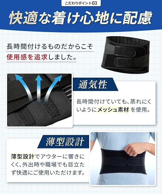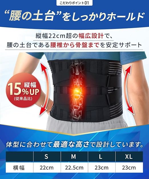 ✅【腰をしっかり支える幅広設計】 縦幅22cm超のワイドサイズで、腰椎から骨盤までを安定サポート。従来品より15%アップの安心感で、長時間の立ち仕事やデスクワークでも快適に支えます。