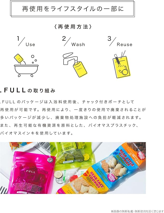 パッケージは再生可能な有機資源を原料とした、バイオマスプラスチック・バイオマスインキを使用。チャックがついているので中身を使った後に、パッケージは捨てずにアクセサリーやコスメ、文房具などを入れるミニポーチとして使えます