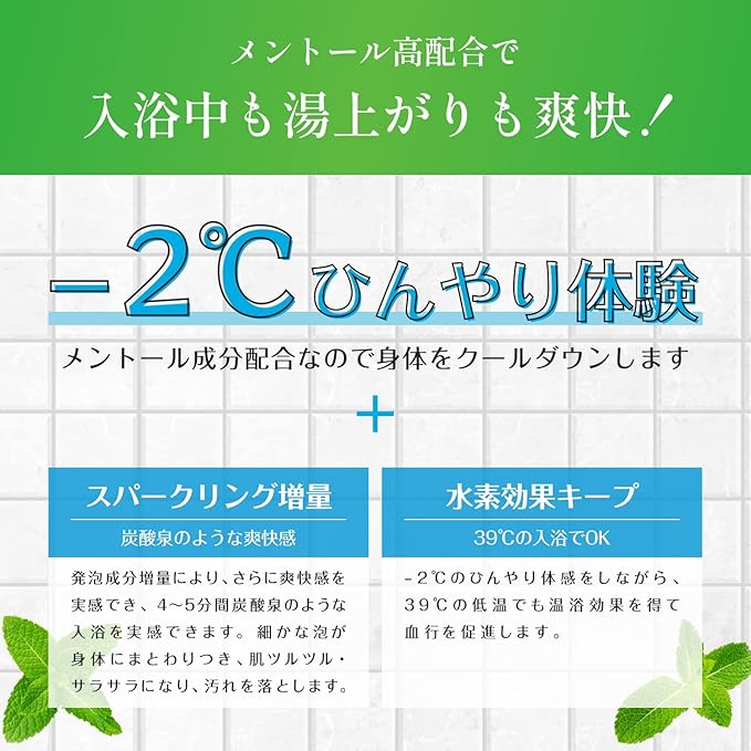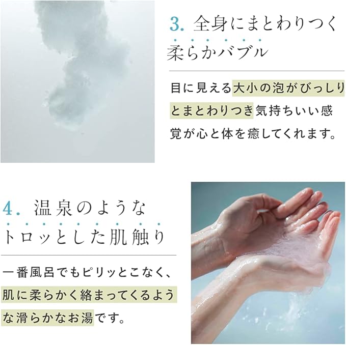 【入浴方法】よくかき混ぜて入浴剤を完全に溶かしてから入浴してください。お湯の濁りが薄くなってきたら入浴しながらかき混ぜてみましょう。シュワシュワがまたもどってきます。※約3時間を目安に入浴してください※白濁や気泡がなくなっても水素濃度は持続しますが、時間とともに減少します。