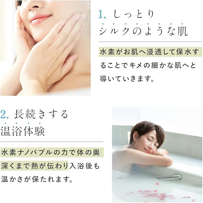 【高濃度水素による温浴体験】1.2ppmの水素ナノバブルが全身を包み込み、体の奥まで熱が伝わることで長続きする温浴体験をもたらします。