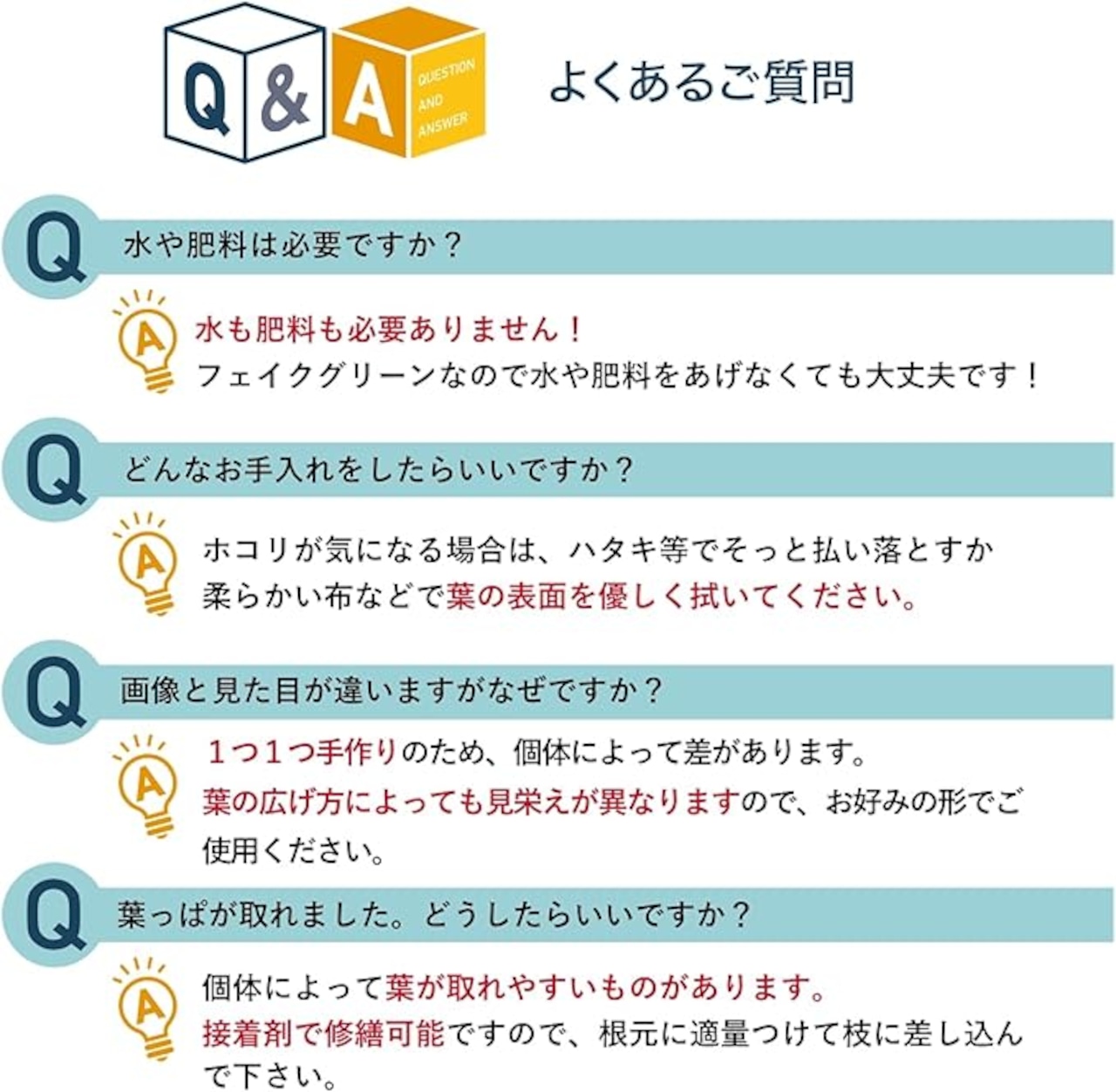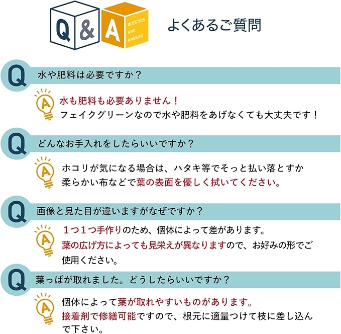 葉は接着剤で取り付けられているため、万が一葉が取れてしまった場合でも、接着剤で接着可能です。