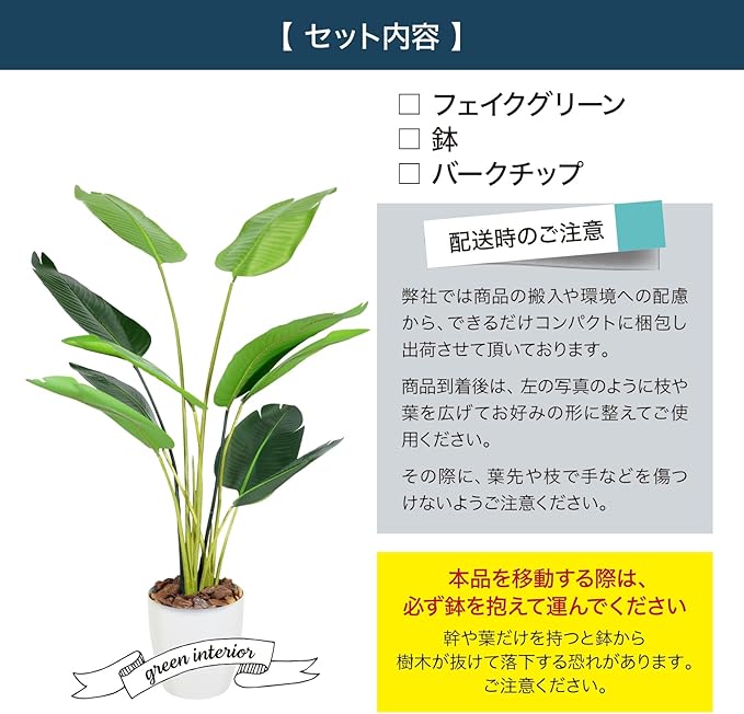 材質 バークチップ:赤松樹皮等, リーフ・枝(ポリエチレン), 中材(ポリウレタン), 鉢(ポリプロピレン)