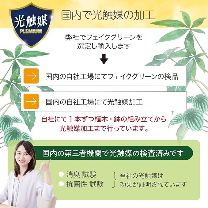 本体・リーフ(ポリエチレン)・枝(ポリエチレン・スチール)・器(ポリプロピレン)・器中材(ポリウレタン)・バークチップ(赤松樹皮等)