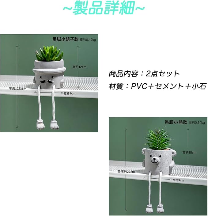 ✅サイズと素材:チョビ髭のサイズは約9 23cm、小熊は約9 27cm。チョビ髭の重量は約490g、小熊は約540g。素材はPVCとセメントで、セットには2個のフェイクグリーンが含まれています。