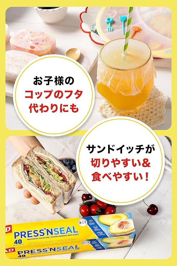 ✅【様々な素材に密着する】gladのラップ「プレスンシール(プレスアンドシール)」は、吸着力に優れていて、様々な素材に密着します。木製容器・紙皿や紙コップなどにもしっかりと密着します。保存容器を選ぶ必要がなくとても便利です。また、電子レンジの使用も可能なので、蜜蝋ラップをお使いの方にもおすすめです。
