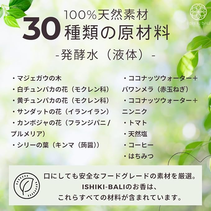 商品特長 独自製法の天然素材から作られた発酵水を多く含み、香りが立体的に広がることで、空間の切り替えや集中したい時間に、呼吸と意識を整えやすい環境づくりを助けます。