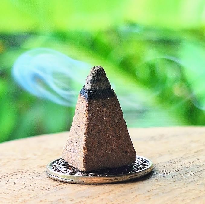 ✦【 ピラミッドコーン香について 】 ピラミッドコーン香は、粉末状の天然植物素材に発酵水をたっぷり含ませ、ひとつひとつ手作業で成型したハンドメイドのお香です。スティック香に比べて発酵水の配合量が多く、火を入れた瞬間から香りが立ち上がりやすく、より深く濃密に感じられる香りが広がります。そのため、空間を切り替えたい時や、浄化を意識した時間に選ばれることの多いタイプです。使用している植物素材・発酵水はスティック香と同一です。