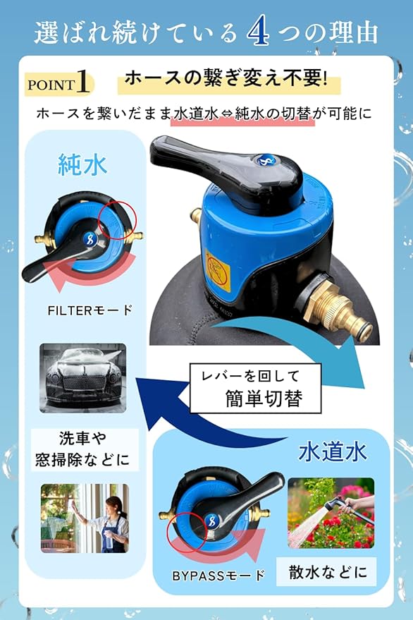 ✅【誰でも簡単!ワンタッチ切替】レバー操作で4つのモード切替が可能です。回すだけだから誰でも簡単に純水と水道水を切替。純水洗車をもっと快適に! ✅【ワンタッチ接続】▶︎本体及び付属のコネクター付きホースは国内大手HOTのタカギ等に対応しています。✅【 接続方法 】▶︎純水器 (IN側) → 水道の蛇口と付属のホースを接続、(OUT側)→ホースリール、高圧洗浄機などに接続。