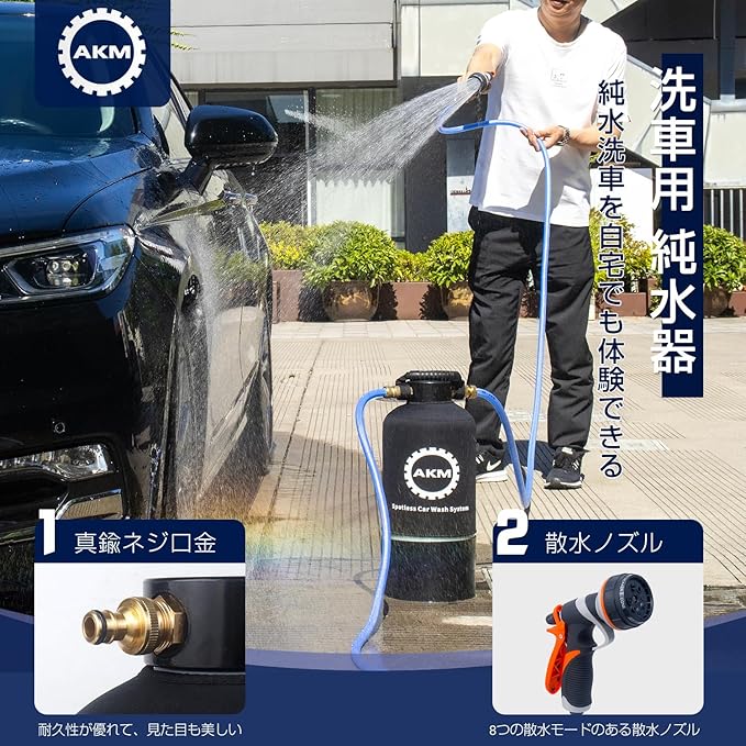 AKM 純水器 洗車用 切替式 水道水 純水 10L容量 真鍮制ネジ口金 ホース2本付属 散水ノズル タンクカバー TDSメーター イオン交換樹脂充填済み