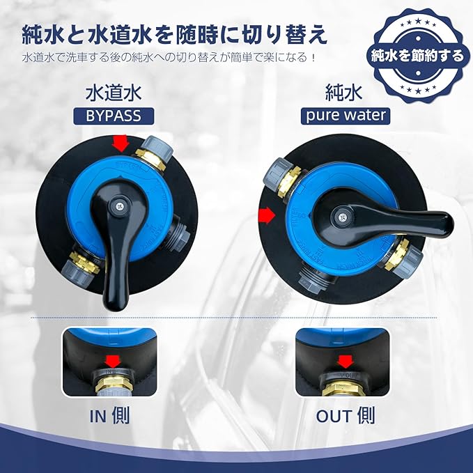 【商品説明】純水器はイオン交換樹脂をいれてイオンを除去士、純水を作るものです。純水を使って洗車することで洗車時に愛車につく水ジミを極めて低いレベルに抑えられます。水ジミになる成分が除去された純水を用いることで洗車後の拭き取りに手間がかかりません。洗車が簡単になります。