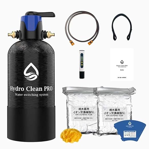 セット内容: バルブ付き純水器タンク本体(容量13.8L)(耐圧FRP製)・イオン交換樹脂10L(漏斗付き)・水道蛇口接続用ホース約2m ・ポータブルTDSメーター(電池付き)・日本語取扱い説明書 ※イオン交換樹脂は有機物となり不安定で劣化しやすい為、ハイドロクリーンプロではタンクに樹脂を入れた状態での発送は一切しておりませんので予めご了承ください。