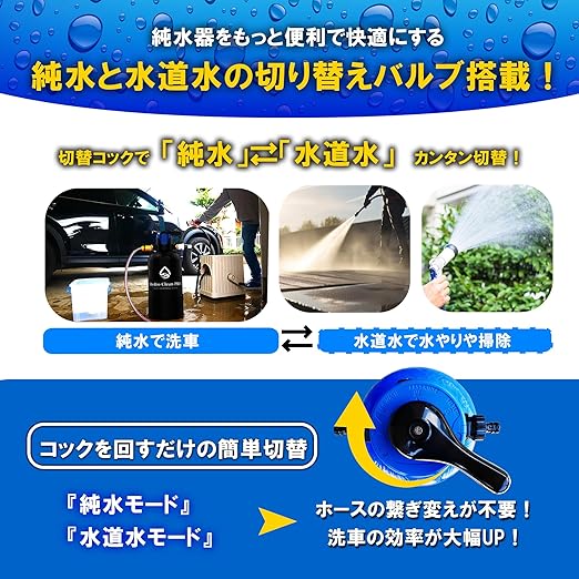 洗車中に「純水」と「水道水」を簡単に切り替えられるモード変更バルブ搭載の高機能純水器!