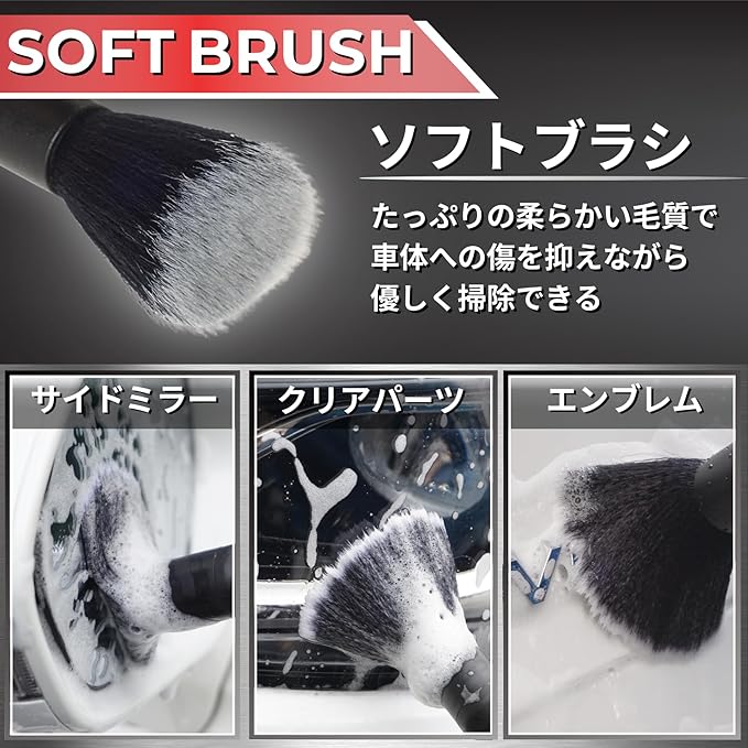 【ソフトブラシ】柔らかい毛質で車体への傷を抑えながらソフトタッチな掃除が可能です。クリアパーツやサイドミラーなどにおすすめです。