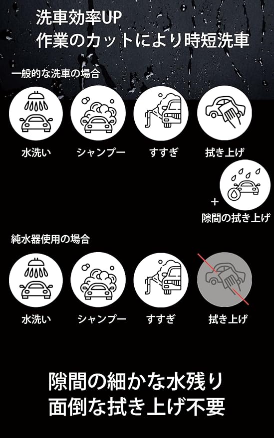 純水を使用することで拭き上げ作業の手間を削減し、洗車時間の短縮に貢献します。