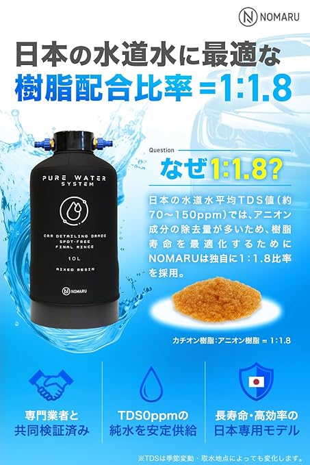 【水質を変えるだけで、洗車の仕上がりが変わる】NOMARUのイオン交換樹脂は、「高い純水性能」「長寿命」「日本の水質に最適化された設計」を兼ね備えた、まさに“洗車と水質管理のための決定版”。自分の車を最高の状態に保ちたい方、多用途で信頼できる純水を求める方に自信を持っておすすめできる製品です。